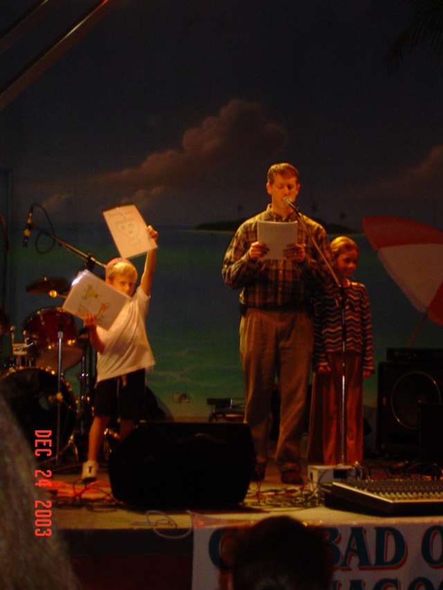 | Picture of the Vice Mayor of Hollywood, Florida, Keith Wasserstrom and his children reading Yehuda the Menorah at a City of Hollywood Chanukah Festival on Dec 24, 2003